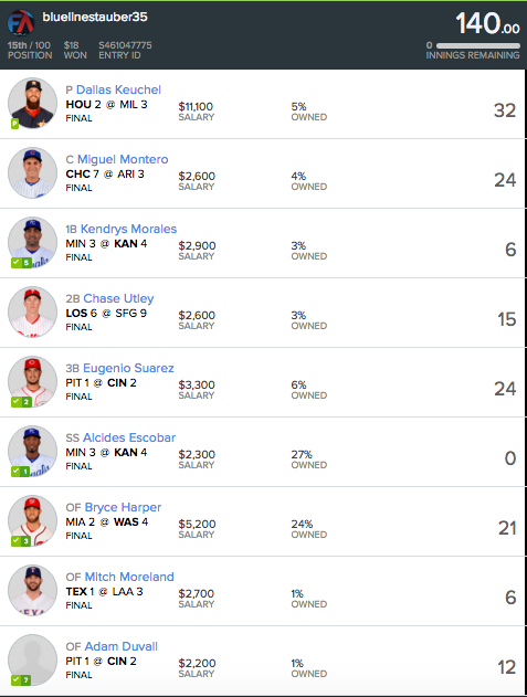 Cruz was lights out in Arlington as usual, and Kinsler also didn’t let me down, hitting a dong with 4 RBI. Again, my approach generally leads to a few low-owned plays, but for this slate, Kinsler was really the only big one at just 10 percent ownership. Obviously, there’s also the Trevor Story situation where he continued his home run streak. Cueto only had four strikeouts, but he did a fine job, going 7 innings and allowing just one run in a big debut in Milwaukee.