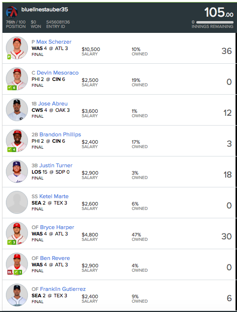 So Bryce didn’t do much for someone with 72 percent ownership, but it doesn’t hurt as much because he had such high ownership. Other than that, I can’t say too many bad things about my guys, mainly because they all reached base at some point.