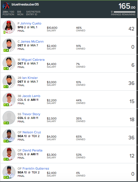 So I was a day late on Trevor Story, but I wasn’t going to let it happen two days in a row. $2,500 for a guy like Story is like robbery. I also identified two really good matchups with the Tigers going against Wei-Yin Chen (they crush lefties, and all had a good history against Chen), and the Mariners going against Martin Perez. Given the fact that Johnny Cueto, in my opinion, was the only safe option at pitcher at $10,600, I also needed to fill the lineup with some value, so I went with Zimmerman, Lamb, and Gutierrez, who all had favorable situations, and were able to complement my big names in Cabrera and Cruz.