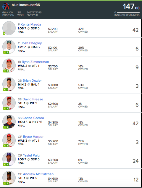 Fading Strasburg was huge because he had over 40 percent ownership in all of my cash games, while Maeda had similar ownership at $4,100 less. But the big play was Correa. He had about 10-to-15 percent ownership in all of my cash games, and largely because the majority of players paid up for Strasburg. Everyone in my lineup was able to do something productive, and it contributed to my min-cash in the Grand Slam.