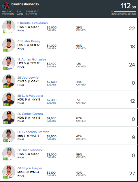 Technically, a lot went wrong. Graveman was outstanding until he allowed a Jose Abreu homer, costing him a shot at the win. Still, 18 points was better than 0 points, and the $5,000 salary obviously helped me pay up for Bryce, Buster, and A-Gon. I had three DONUTS in Lowrie, Correa, and Reddick, but luckily, it didn’t cost me.