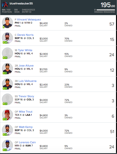 Velasquez did more than I could have possibly imagined, striking out nine, and allowing no runs in 6 innings. Paying up for Trout and Cain had mixed results, where Trout didn’t do anything, but Cain homered. On the other hand, my Coors Field did a solid job. Matt Kemp was obviously the play of the night, but still wasn’t over 75 percent owned.  He hit two home runs while Derek Norris reached base three times.