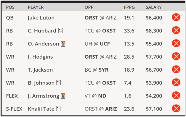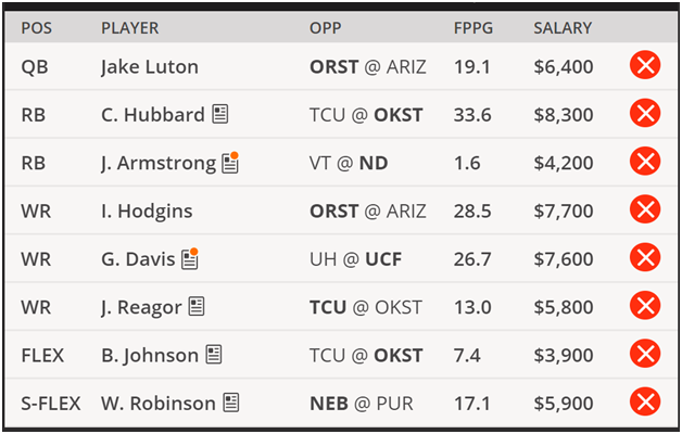Prior to last week, Gabriel Davis was the best receiver in college football for over a month. He now gets another juicy match-up with a Houston team that ranks in the bottom third of the nation against the pass. Dillon Gabriel will look for Davis and I see another 150 yards and two touchdowns. In my cash games, I have been able to fit Hubbard, Davis, and Hodgins. These three guys just stand out above the rest of the field and I think you do what’s necessary to play them. We have the value to make it work.