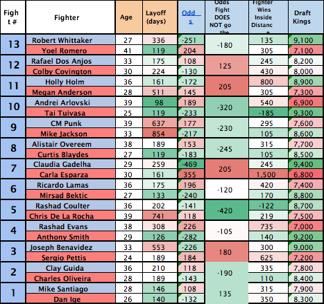 This is an interesting card from a DFS perspective, as there are about 4-5 “LIVE DOGS”, but in my opinion, their really aren’t any “LIVE DOGS” that I truly like and have confidence in, but I guess that’s why they call them “dogs”. When compiling DFS rosters there are a few different routes you can take; a traditional middle of the road approach is doable this weekend, but if you do work hard enough you can put together a solid “Stars & Scrubs” lineup or two! One thing that I did notice when putting together some example lineups is that there are plenty of options when it comes to lineup construction this weekend, and maybe that’s just because it’s a PPV card and we know quite a few of the fighters, but regardless, there are plenty of different roads to take when compiling rosters for this event. This should allow for some solid variance within GPP’s, and not so much overlap, but who knows….only time will tell! Without further ado, let’s jump into an overview of the matchups, the betting lines, DK salaries, and some other useful info provided directly below here. Below the matchup breakdown you’ll see that I highlighted a number of fighters that I am targeting within the 3 different price ranges (Top-Tier, Mid-Tier, and Live Dogs). Feel free to use this info as you see fit, and use the example lineups for…..well…...an example as to how to build lineups. As always, please feel free to follow me on Twitter during the event as I’ll be giving my commentary, opinions, and some wagers that I feel confident in. You can follow me on Twitter @TJ_Scott_MMA
