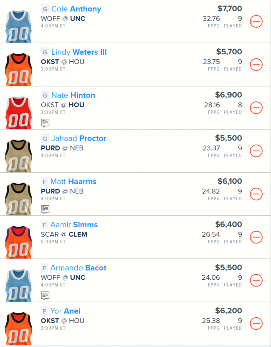 I haven’t touched on the Clemson Tigers just yet, but Aamir Simms has struggled in the last two games and he is going to want to come out and demolish here at home. The Gamecocks play faster than Clemson and it’ll be the Tigers that are playing up in pace here. Simms has shown his upside a few times this year and was just over 40 fantasy points for two games in a row. I like him to have another big game here as he matches up well with F Justin Minaya. Simms has had his price come down after the last two games, and this is the perfect time to jump on this opportunity. Simms is an easy play in cash games in this match-up for me.
