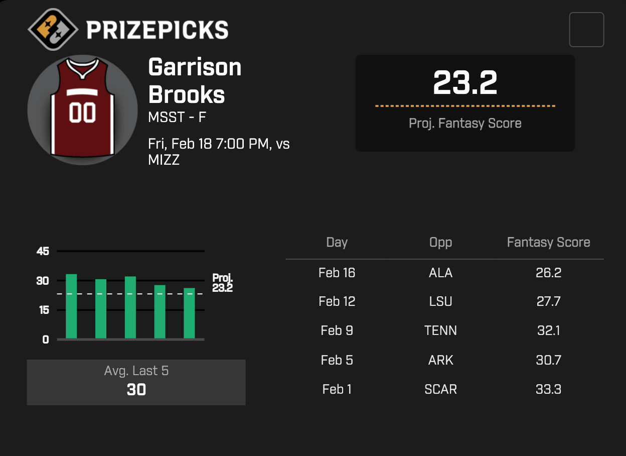 Mississippi State is another team with a favorable matchup tonight. The Bulldogs will face a subpar Missouri squad that has the SEC’s second-worst defense and struggles on the glass. It’s a good situation for Garrison Brooks to rack up paint points and rebounds as he takes advantage down low. Ignoring the matchup for a second, Brooks has over 23.2 fantasy points in five straight games coming into tonight. Some of those efforts have come against tougher defenses (LSU, Tennessee, Arkansas). Things get much easier tonight and it’s hard to imagine him not eclipsing this 23.3 fantasy score.
