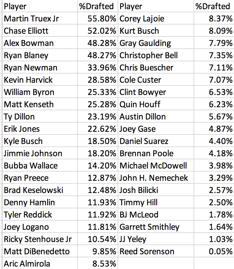 Welcome to a fun little segment of the Optimal Lineups I’m going to call “Hedge Funds,” where we have the benefit of knowing ownership percentages from DraftKings’ Wednesday night NASCAR DFS contests. DK has opened up NEW contests for Thursday night’s race so if you want a little more action using the ownership numbers that we have, by all means, join me! However, this is still a tough time so you don’t necessarily need to play a second slate tonight. Here is a look at the ownership numbers from the $555K - $100K to first place GPP on DK: