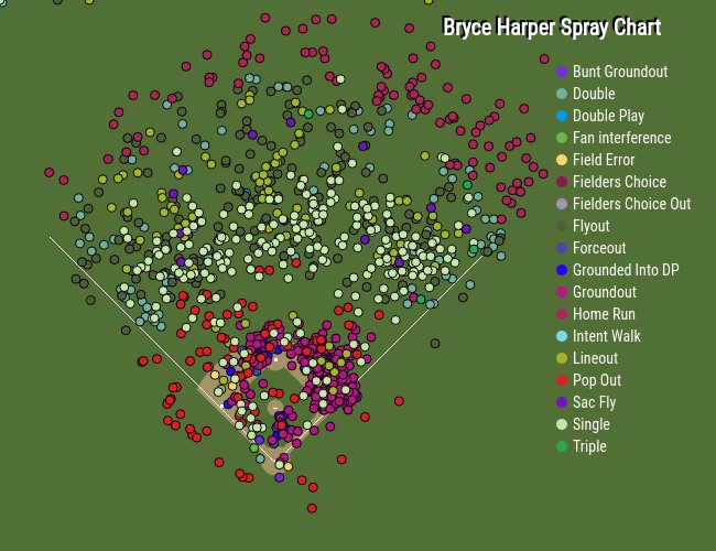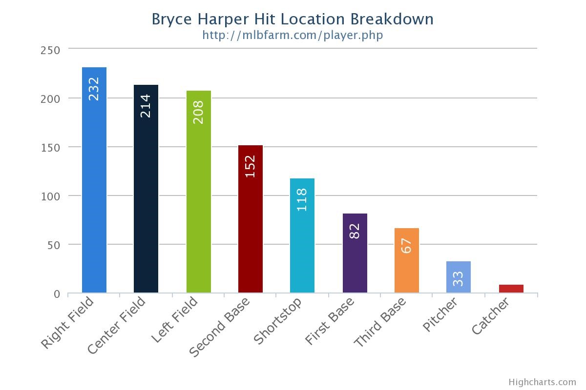 Harper’s averaged a home run every 15.23 at-bats and does not need to pull the ball to hit one over the fence. In fact, he’s able to drive the ball to all fields which only enhances his power upside, if this exists with him. Here’s Harper’s hit location chart from the last three years as a point of reference: