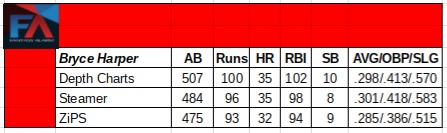 Trying to predict what Harper could do this year could be frustrating. There’s so many possible outcomes, he almost could be projected in ranges rather than one agreeable number. Most projection systems will default to the last three years of statistical data to try and arrive at reasonable numbers. However, Harper does not seem to fit this mold. For instance, here’s his three listed on Fangraphs as a frame of reference: