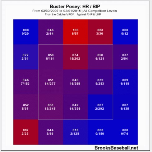 Focus on the four boxes in the lower right-hand corner. This appears in red in the savant chart and shows how Posey (nor many major league players not named Vlad Guerrero) can hit these pitches for power. For another frame of reference, here’s Posey’s home runs on balls in play chart from BrooksBaseball as well: