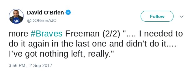 During a shortened season featuring a wrist injury, Freeman still finished the year by raising his slash lines versus his 2016 results in all three categories, cut his swinging-strike percentage and increased contact without changing his chase rate. In fact, Freeman’s quote from this tweet last year indicates he played through injury at about 80-to-85 percent health after he returned from rehab: