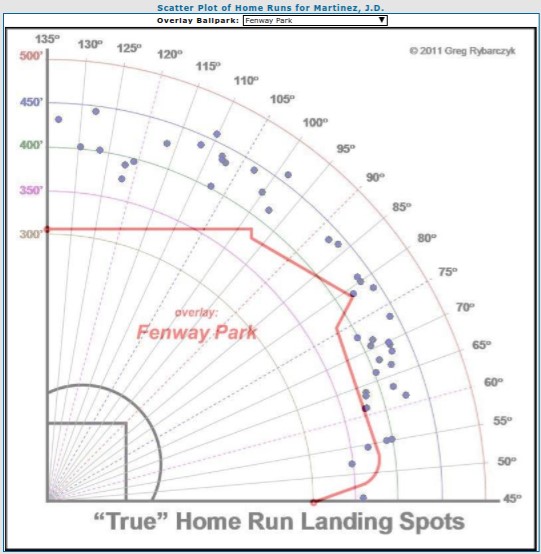 This takes into account the landing spots for home runs, but like the BaseballSavant.com chart, does not account for line drives or fly balls which could hit the monster instead of clearing it. In spite of this, here’s his spray chart from last year with Fenway as the backdrop: