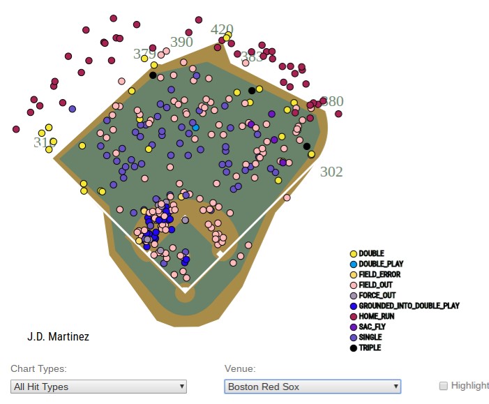 With a solid baseline in all of the slash numbers and fully supported by underlying metrics, its time to transition to his power. Martinez averaged a home run every 14.17 at-bats the last three seasons. In order to illustrate his transition to Fenway, first, here’s a look at his home runs from last year using a chart from hittrackeronline.com which no longer seems to exist, but saved prior to its disappearance: