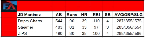 With Arizona, Martinez hit a robust .302/.366/.741 in 62 games tallying 29 home runs and 65 RBI in 47 games hitting fifth along with 15 at cleanup. Moving to Boston, and to a higher spot in the batting order, Martinez should be able to rack up counting statistics. The Red Sox cleanup hitters accrued 83 runs in spite of their paltry average and on-base percentage with 93 RBI in 645 at-bats. Here’s where things get slippery for Martinez who’s averaged 496 at-bats the last three years.