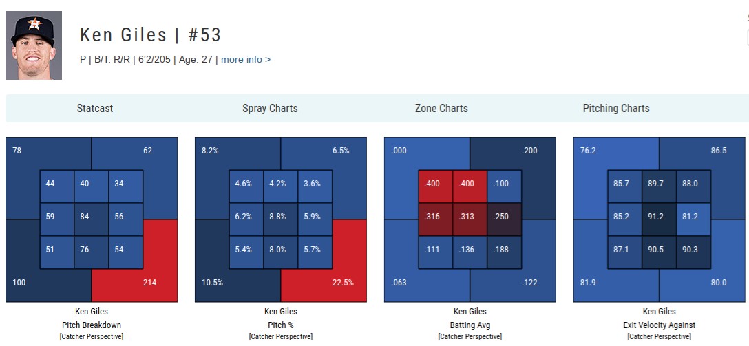 While the slider resulted in 73 of his 83 strikeouts, Giles needs to find a way to more effectively use his fastball. He will not turn 28 until September and the Astros use analytics very well. But the fluidity the team exhibited along with a stocked bullpen means Giles cannot afford a slow start if he hopes to close a majority of the games this season. Here’s a look at his zone charts courtesy of Baseball Savant (Statcast):