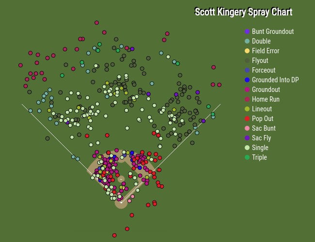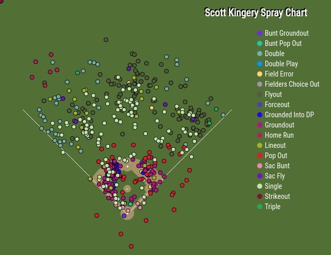 Things exploded for Kingery last year. He started the season repeating Double-A appearing in 69 games with 62 runs, 18 home runs, 44 RBI, 19 stolen bases and a .313/.379/.608 slash line. This split features his highest fly ball and home run per fly ball percentages during his short time in the minors. He then advanced to Triple-A for 63 games with 41 runs, eight home runs, 21 RBI and 10 steals with a .294/.337/.449 slash line. His totals between the two levels work out to 543 at-bats with 103 runs, 26 home runs, 65 RBI, 29 stolen bases and a .304/.359/.530 slash line. Very encouraging. Once again, here’s his spray chart with the noted spike in power: