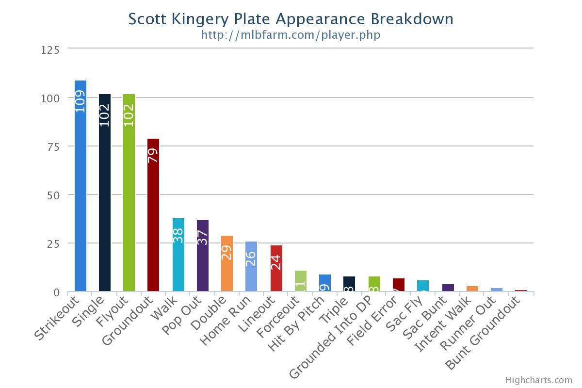 Most of the pitchers he faced rated between Double-A and Triple-A, which he torched last year. Yes, Kingery will hit, but how much and how well this year will be open for debate. Plus, how many strikeouts will he accumulate? While his spray chart from last year looks great above, here’s his plate appearance results from his breakout year in Double-A and Triple-A:
