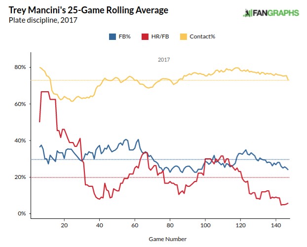 In order to set the proper tone on Trey Mancini, owning shares did not seem practical prior to working on this profile. Mancini rode a strong start to his promotion last year to a very solid finish with 65 runs, 24 home runs, 78 RBI, one stolen base and a .293/.338/.488 slash line in 149 games. He struck out 23.7 percent of the time versus a walk percentage of 5.6 with a .349 weighted on-base average. His weighted runs created plus finished above league average at 117, again, solid, not spectacular.