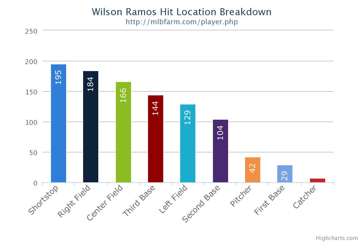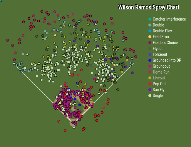 Note the large amount of ground outs to his pull side of the field in spite of being able to hit the ball out in the air to right field. For his career, Ramos hits ground balls almost three out of every four at-bats when pulling the ball. But, when he goes to the opposite field, Ramos hits a fly ball 51 percent of the time. Interesting to say the least.