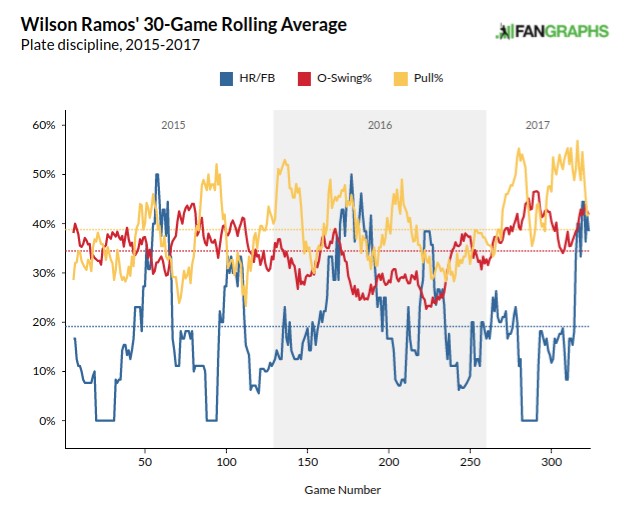 In an effort to discern if Ramos sold out for the home runs last year, here’s his pull percentage, O-swing rate (swings and misses at pitches outside the strike zone) and home run per fly percentage from the last three years in a 30-game rolling basis: