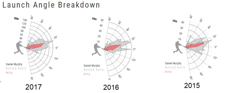 So how do we know who is being impacted by this change in philosophy and just how much of a difference does it actually make?  In 2017 the Washington Post really dug into this question and their findings were impressive.  I suggest reading the entire article which can be found here but one of the players they profiled was Daniel Murphy. In 2015 Daniel Murphy had an average launch angle of 11.1 degrees. In 2016 his average launch angle increased to 16.6 degrees and what we saw was quite impressive as Murphy raised his batting average from .281 to .347.  He also set career highs in doubles (47), home runs (25), slugging percentage (.595) and OPS (.985).  At 31-years-old, Daniel Murphy had the best season of his career.  Not much changed for Murphy in 2017 either as he nearly matched his production all the way down the line.