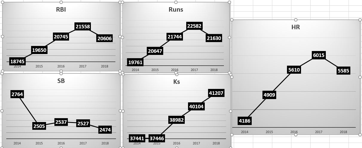 Similar trends took place last year as for the first time in five years, offense went down.  There were 430 less home runs hit last year plus both runs and RBI went down significantly while strikeouts rose by about the same level they had in each of the last two seasons.