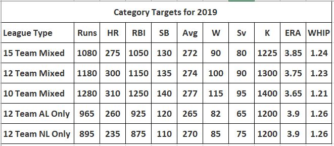 Here is a chart that specifies the targets that I use in the leagues that I play in.  Again, you should examine your leagues to see if there are anomalies based on league members dumping categories or playing in a different way than the leagues that I play in.