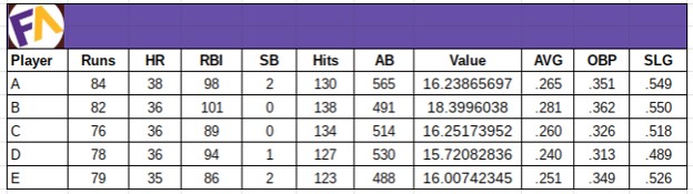 For clarity of the thought process, the value column weighs the counting statistics along with average in rotisserie scoring to arrive at a weighted number to differentiate a group of similar players. This set represents five potential power bats to target using the ATC projections:
