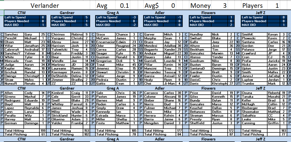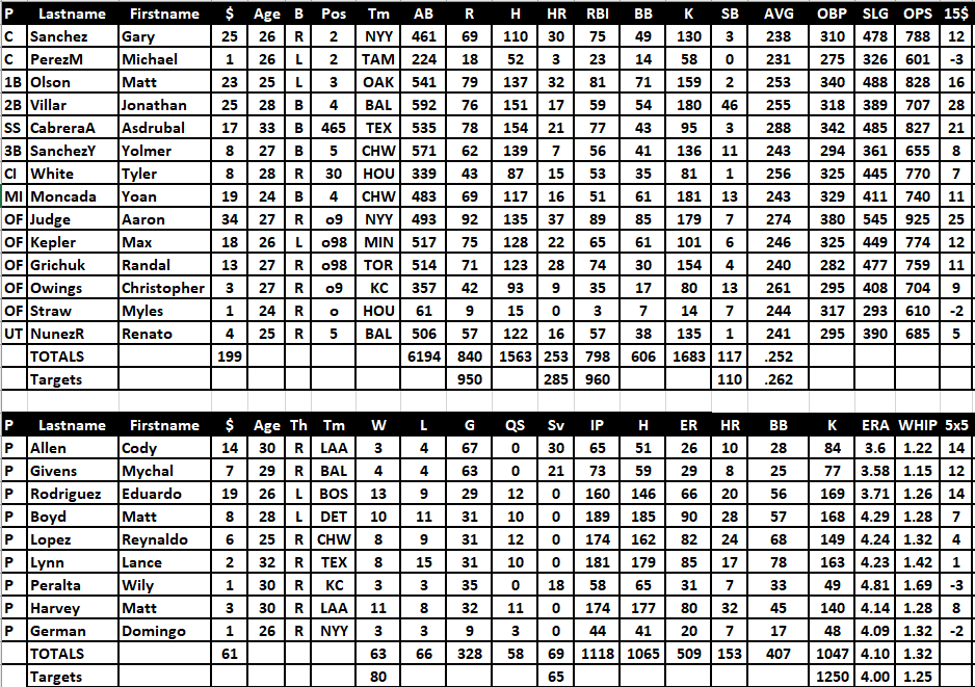 This year, we have a different more difficult problem. Stealing signs. The Astros, Red Sox and possibly other teams were relaying signs to the batter in real-time to allow hitters to know what was coming. This could be a reason for some of the home run explosion. If we suggest that three teams were doing this and therefore 10% of the teams had a home run edge. This would mean that there was a boost from that we need to account for in this year’s projections and category targets. More RBI and runs scored as well for all those hitters. We will take down the categories slightly for this.