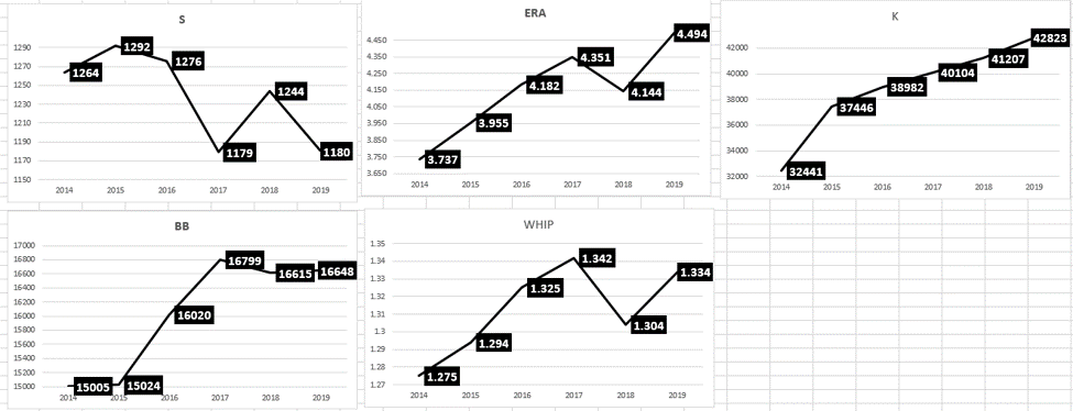 As you can see from the chart above, home runs were up 62% since 2014 with only one decline year in 2018. Why the drop in 2018? Well, there was the humidor being used. There were the balls being made less tightly wound, allegedly. Umpires were instructed to squeeze the strike zone. All factors.