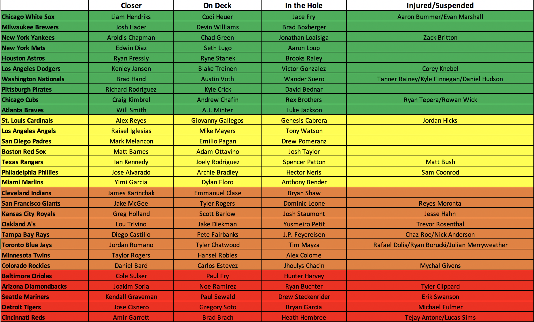 If you've been a subscriber here at Fantasy Alarm, you've seen the Fantasy Baseball Closer Grid before. If you're new, it's very simple. We not only list who the closer is for each team, but we then go another two-deep into the bullpen to let you know who would be next in line to accrue saves should there be an injury or a change, as well as which relievers you may want to target if your league scores for holds. This isn't about how the teams' depth charts always reads, so keep that in mind. Sometimes the heir-apparent is an obvious one, but in many cases it is not. We look for things like skill set, contact rates, pitch-command, pitch-mix, how many lefties are in the bullpen, who has worked as a closer before and who has the experience in high-leverage situation among other things.