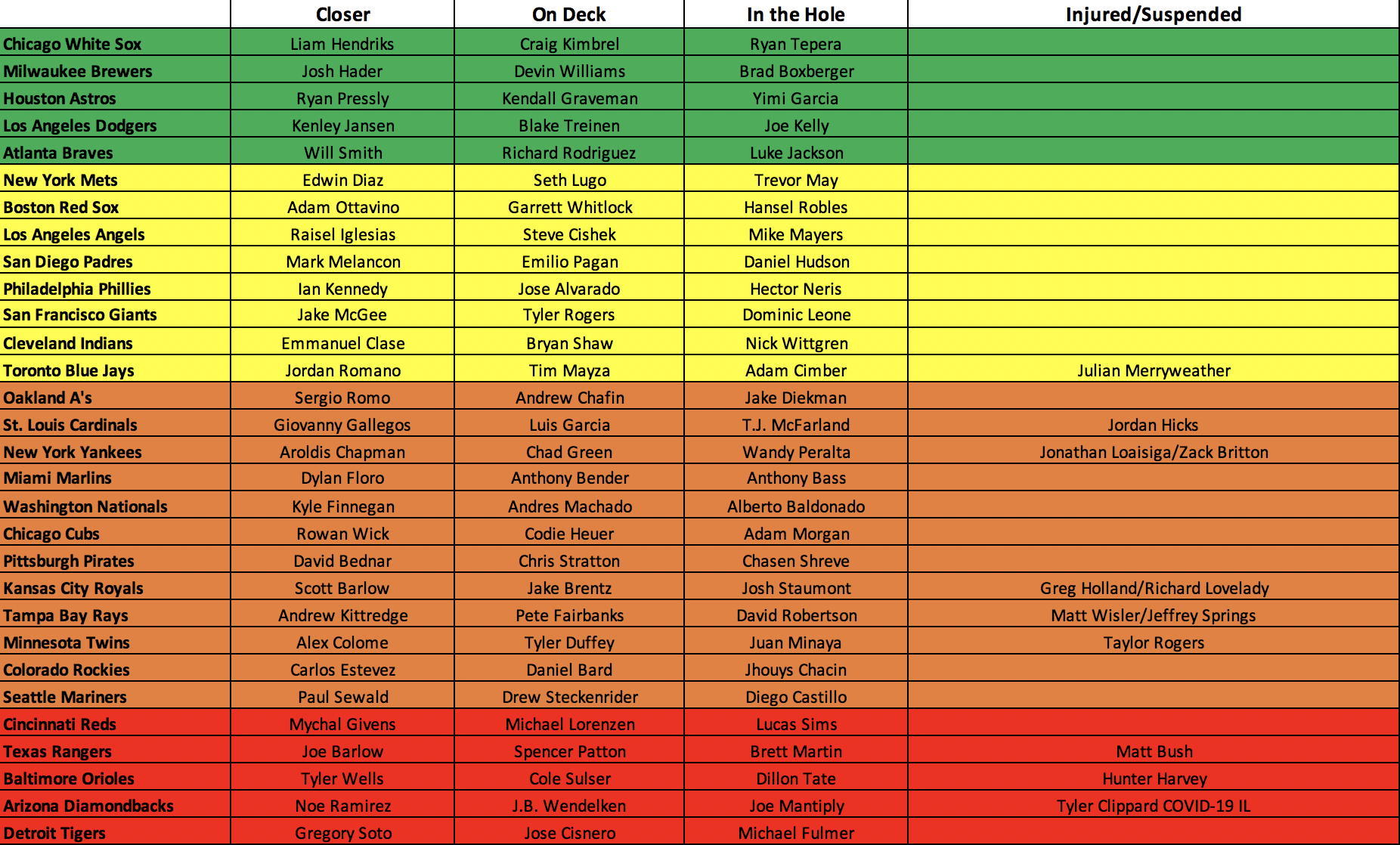 If you've been a subscriber here at Fantasy Alarm, you've seen the Fantasy Baseball Closer Grid before. If you're new, it's very simple. We not only list who the closer is for each team, but we then go another two-deep into the bullpen to let you know who would be next in line to accrue saves should there be an injury or a change, as well as which relievers you may want to target if your league scores for holds. This isn't about how the teams' depth charts always reads, so keep that in mind. Sometimes the heir-apparent is an obvious one, but in many cases it is not. We look for things like skill set, contact rates, pitch-command, pitch-mix, how many lefties are in the bullpen, who has worked as a closer before and who has the experience in high-leverage situation among other things.