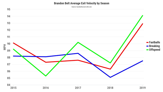 Brandon Belt , 1B SFG – There is another interesting guy that meet the same criteria above that Dozier met, and that is San Francisco’s Brandon Belt . In fact, Belt is hitting even more fly balls than Dozier and only a few less line drives. Belt is making hard contact and currently on pace for 34 home runs, and boy wouldn’t that be nice if he could get to that mark! The veteran corner infielder flirts with about 20 home runs each year, but injuries in recent seasons have prevented him from reaching that mark. Health willing, he should burst through that 20 home run brick wall, largely due to a career best .055 HR/PA mark through the first 19 games of the season, per Baseball Savant. Albeit an incredibly small sample size, look at the early season returns on all pitches in terms of Belt delivering the ball to different parts of the field with authority.