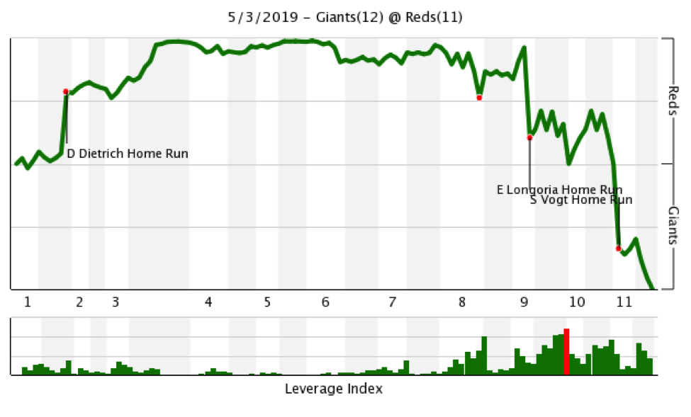 Dietrich’s two home runs obviously got the Reds out to a large lead, but it didn’t turn out to be enough. At one point the Reds had a win expectancy of 99 percent when Evan Longoria made the first out of the sixth inning with the Reds leading 10-3. But after that out the Giants got hot. The next five batters either reached base or drove in a run, and the Reds lead was cut to three by the end of the half inning. The Reds stretched the lead to 11-7 through seven, but the Giants scored three in the eighth to make it 11-10. A Stephen Vogt home run with the Giants down to their last out sent the game to extra innings, and Longoria completed the comeback with a solo homer in the top of the 11th that ended up being the game winner. Here’s a look at the game graph courtesy of Fangraphs.