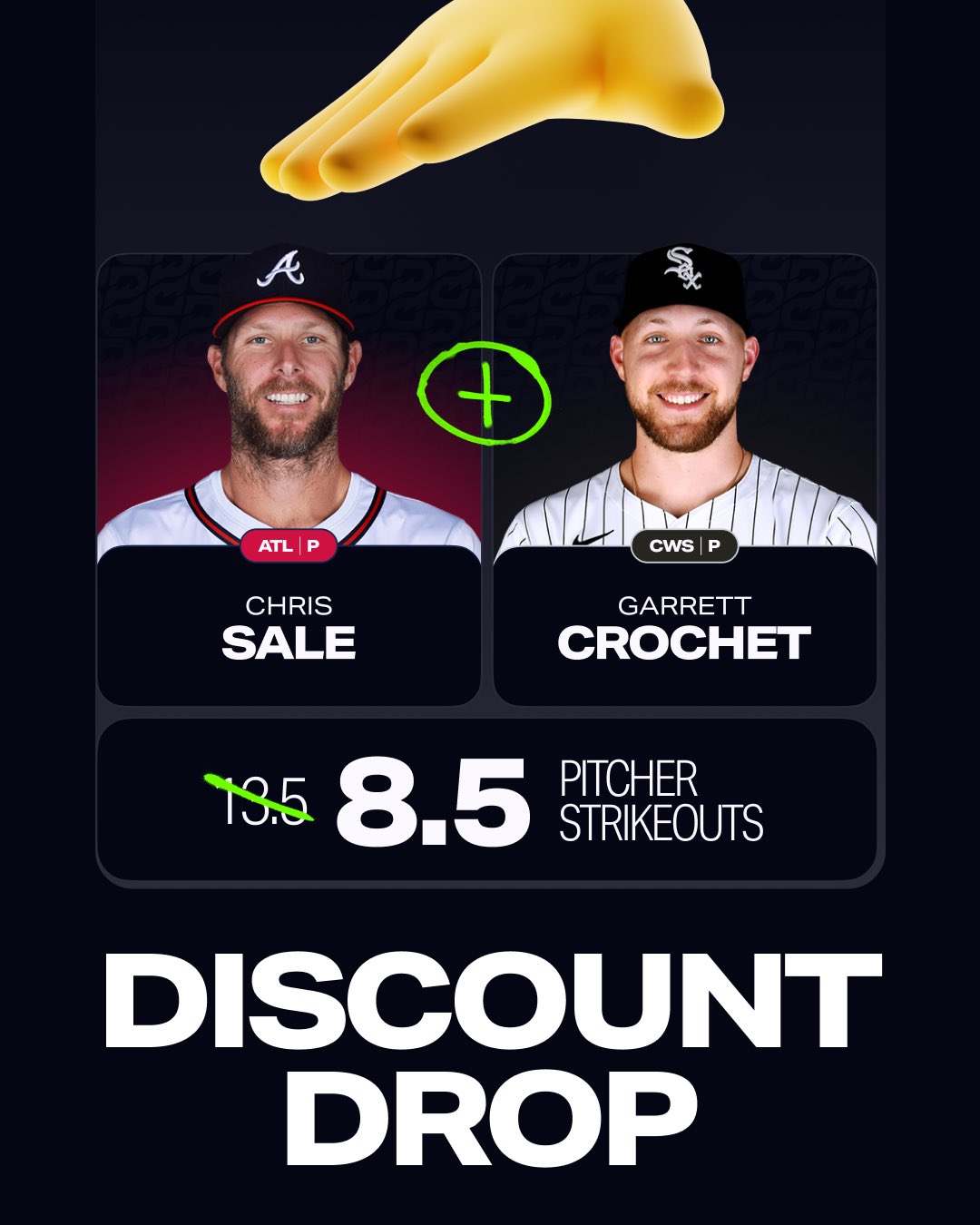 After that, make a selection with a discounted Garret Crochet + Chris Sale strikeout projection. They just need to surpass 8.5 strikeouts between the two of them in order for the square to be deemed a winner.