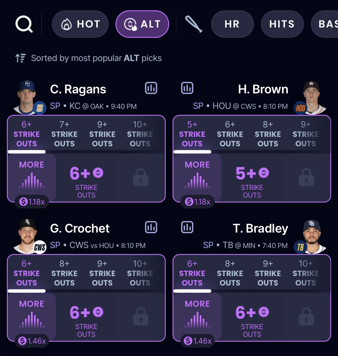 We get to pick today with Wildcard Wednesday between Garrett Crochet 13.5 Outs or Cole Ragans 14.5 Outs. While I think both are great options, the matchup for Ragans is far more favorable than the matchup for Crochet and, therefore, I will take the higher projection with Ragans taking on the Oakland Athletics.