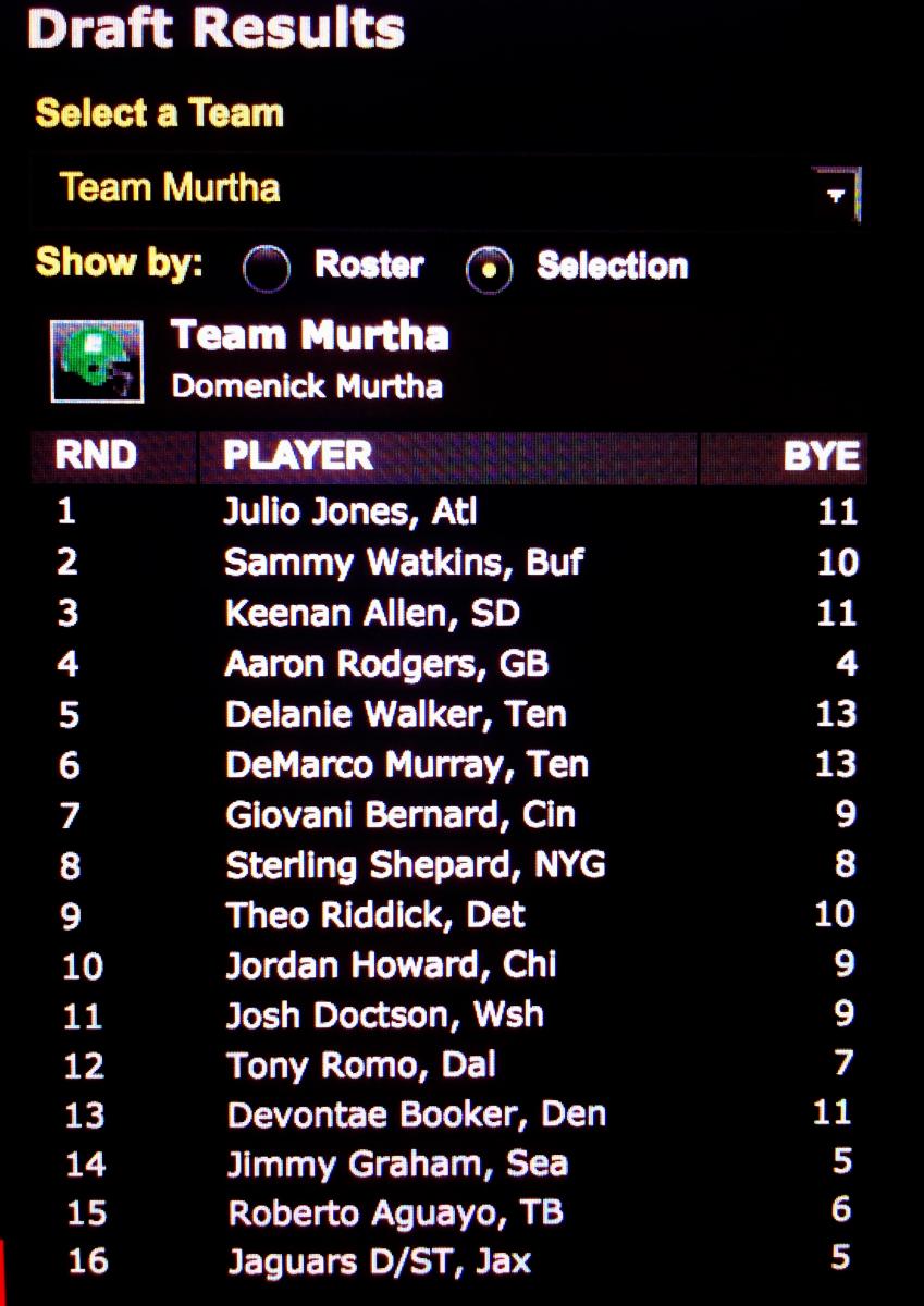 I got arguably the best player in the draft in Julio Jones and then with my next two picks, another two top-10 caliber receivers in terms of both talent and potential production. Aaron Rodgers and Delanie Walker may have been reaches in the fourth and fifth by a round or two, but remember we are going running back last, so the other positions must come first at all costs.