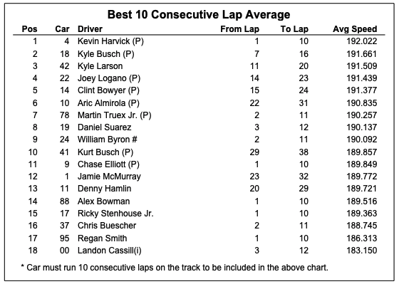 - Compared to Chase Elliott and Kurt Busch, Kevin Harvick has run the fastest average laps of those three and in fact he’s got the best 10-lap average with half of practice left in this session.