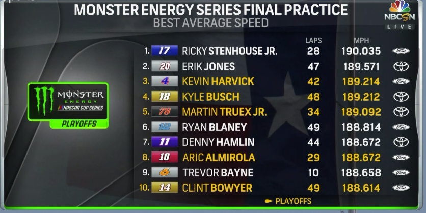 - Ricky Stenhouse Jr. put down the fastest lap of the day as he took over the top spot in Final Practice and that lap came as the 15th of a 16-lap run