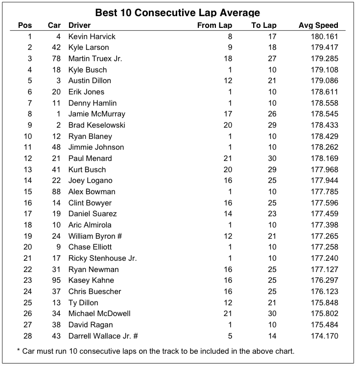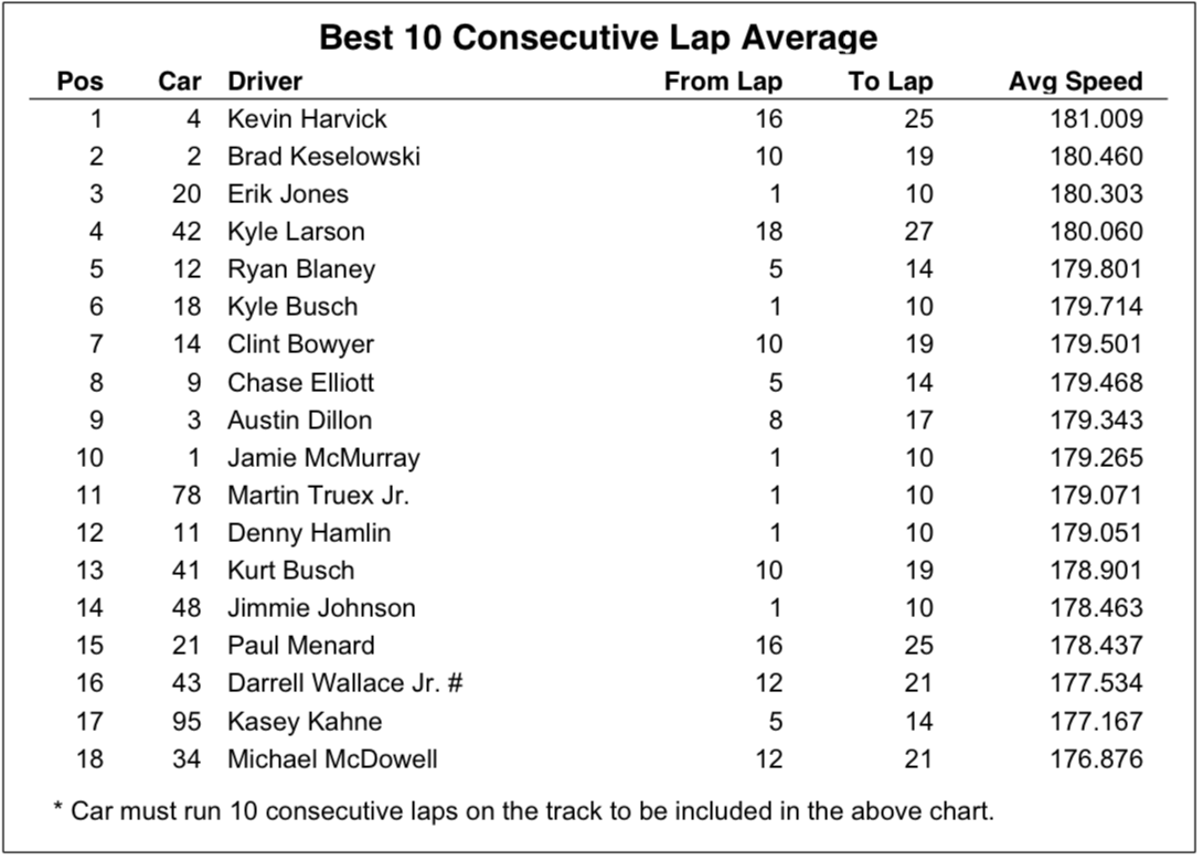 • By the end of practice Kevin Harvick had the fastest lap, fastest five-lap average, fastest 10-lap average, and fastest 15-lap average as well.