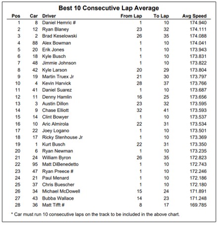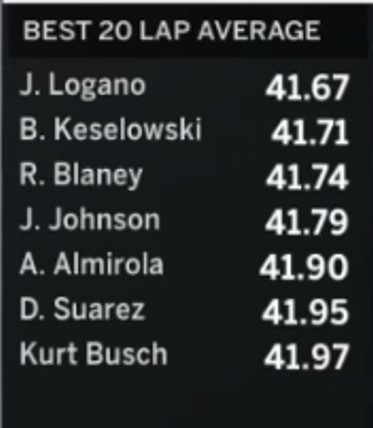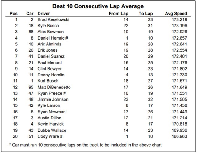 - Kyle Busch had the best 15-lap average of the session but Brad Keselowski led the five-lap and 10-lap averages but didn’t run 15-consecutive laps otherwise he would have led that too.