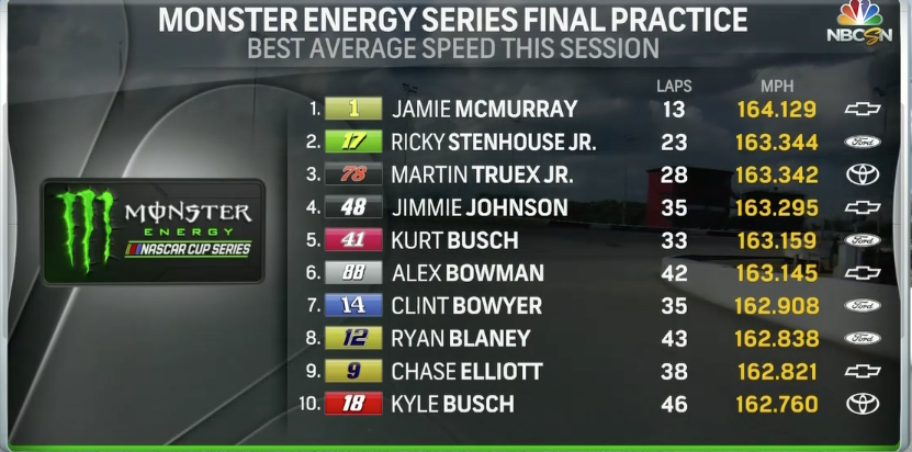 - Jamie McMurray had a big time fluid leak with 40 minutes left in practice and stopped it on the front stretch and the car was towed to the garage.