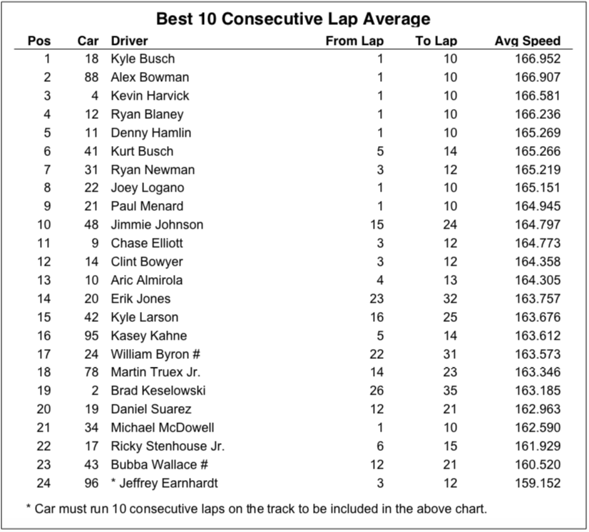- Three of the four Hendrick Motor Sports cars finished inside the top-10 for average lap speed across the full session. The only one that missed was William Byron.