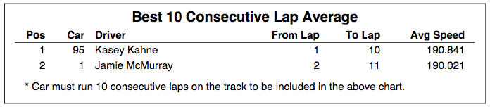 9 | 2 | Brad Keselowski | Ford | 25 | 44.573 | 201.916 | 16 |