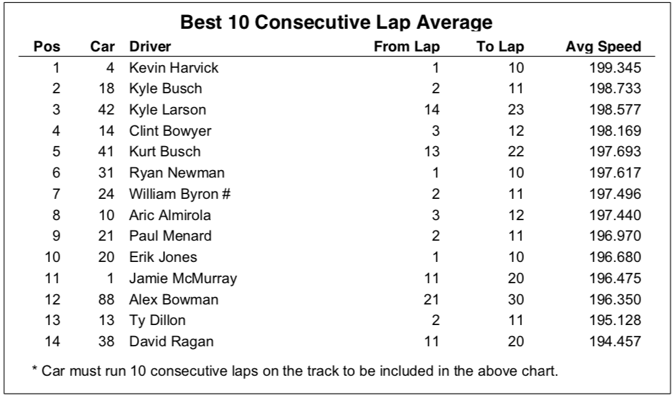 • Only two cars averaged a lap of better than 200 mph being Kevin Harvick and Kyle Larson.