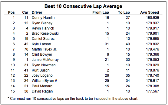 | 9 | 10 | Aric Almirola | Ford | 17 | 185.179 | 29.161 | 185.179 | 17 |