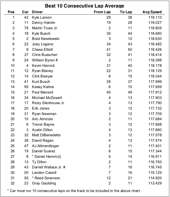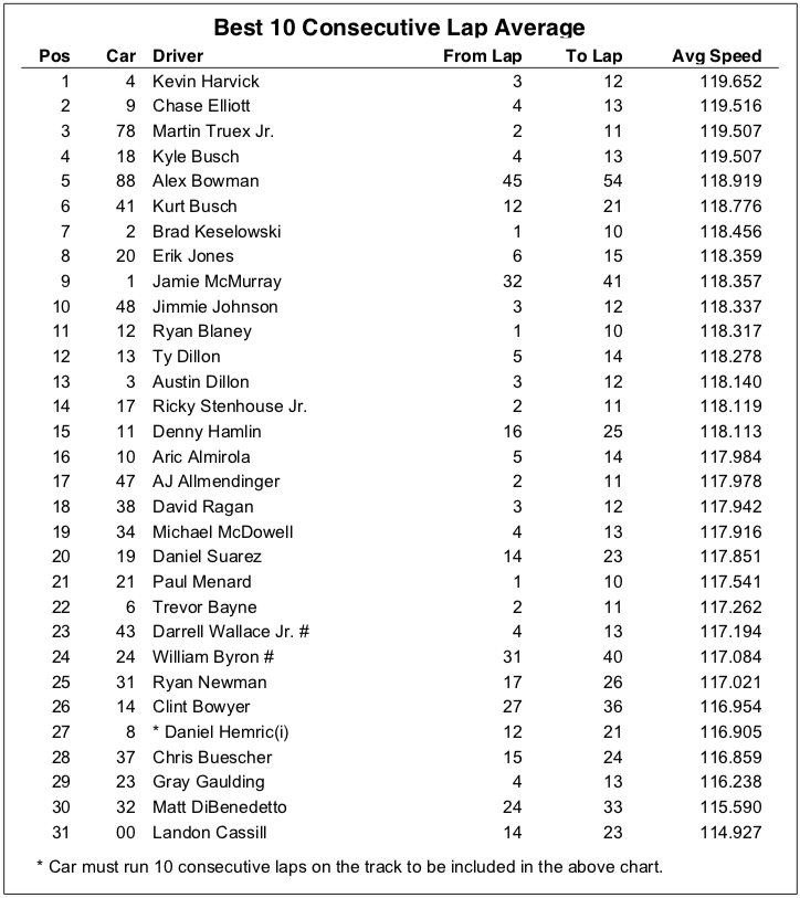 | 2 | 43 | Darrell Wallace Jr. # | Chevy | 34 | 119.348 | 22.509 | 119.952 | 31 |