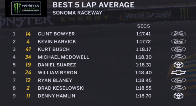 - Kevin Harvick has the best 10-lap and 15-lap average with 3 minutes left in the session and AJ Allmendinger is the best 5-lap average car.