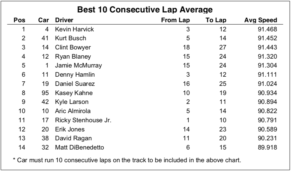 - Stewart-Haas cars are the top three in 10-lap average which sets them up well for the race.