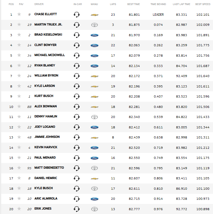 • Chase Elliott didn’t handle the entrance to the backstretch chicane well and didn’t like the handling so he took the car back to the garage for adjustments